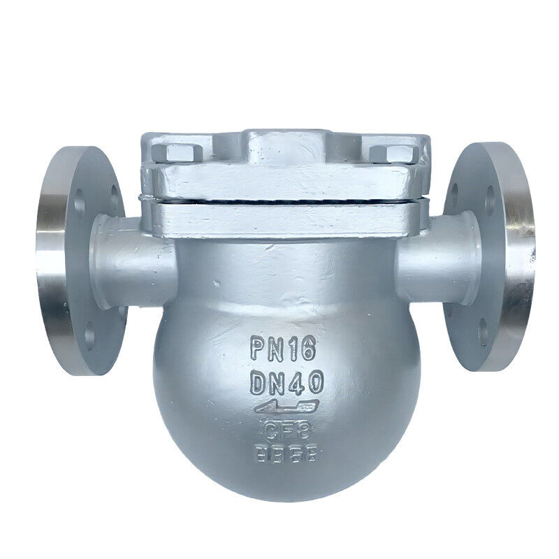 When the system is initially started, the automatic air discharge device is in an open state, quickly removing the non-condensable gases in the system. When steam and hot condensed water enter, the temperature in the valve chamber rises, and the air discharge device automatically closes; at this time, the float rises and falls automatically with the water level, driving the lever to adjust the opening degree of the valve seat hole, and continuously discharging the condensed water. When the condensed water stops entering, the float descends due to its own weight, driving the lever to drive the valve core to close the valve seat hole. Because the valve seat hole is under the condensate water level, it forms a water seal, and during operation, there is no fresh steam leakage.